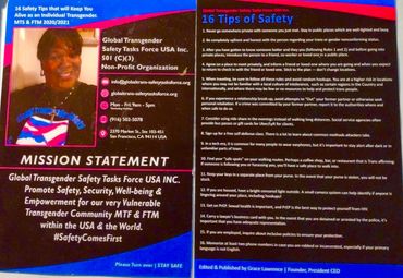 #SAFETY >In 2020 GTSTF USA Safety Video and Safety Flyers are now being distributed in all fifty states of the USA and around the world. In 2023 Global Safety, Security, hate crime Prevention and Well-Being Conference in San Francisco, California, will be held November, if ALL funding is secure by September of 2023,With the trans and gender–non conforming leaders from the U. S and around the world, there will be sponsors to discuss ways to network regarding how to prevent the killing of and other hate crimes against trans and gender–non conforming people.